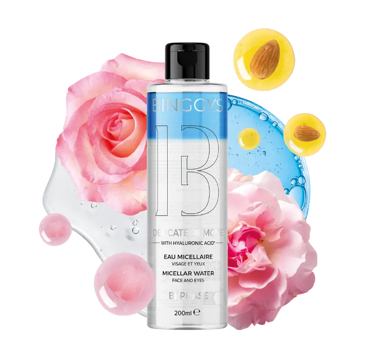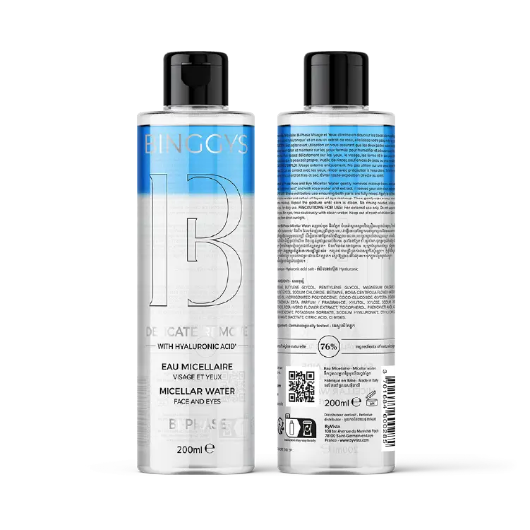 Delicate Remove Bi-Phase Face and Eyes Micellar Water gently removes makeup traces, even waterproof ones. Enriched with hyaluronic acid* and with rose water and extract, it leaves your skin clear and comfortable.