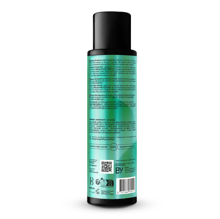 Binggys Sebo-Regulating Shampoo cleanses hair while regulating excessive sebum production. Enriched with nettle extract, kaolin, and Polyquaternium-22, it delays the hair regression phase and leaves hair supple and light.